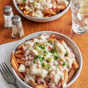 Quintessential Quebecois comfort food: golden fries crowned with squeaky cheese curds and bathed in a hot, glossy gravy. Price: $10.95