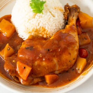 Chicken thigh in a tomato-based sauce, seasoned with aromatics like garlic and herbs, served alongside rice—a comforting, homestyle entrée combining protein and grains. Price: $15.95